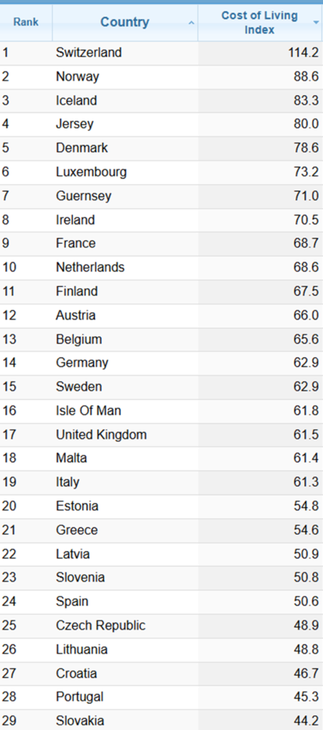 歐洲雖然表面上統一使用歐元,但各國的物價水平卻大不相同。以2023年為例: